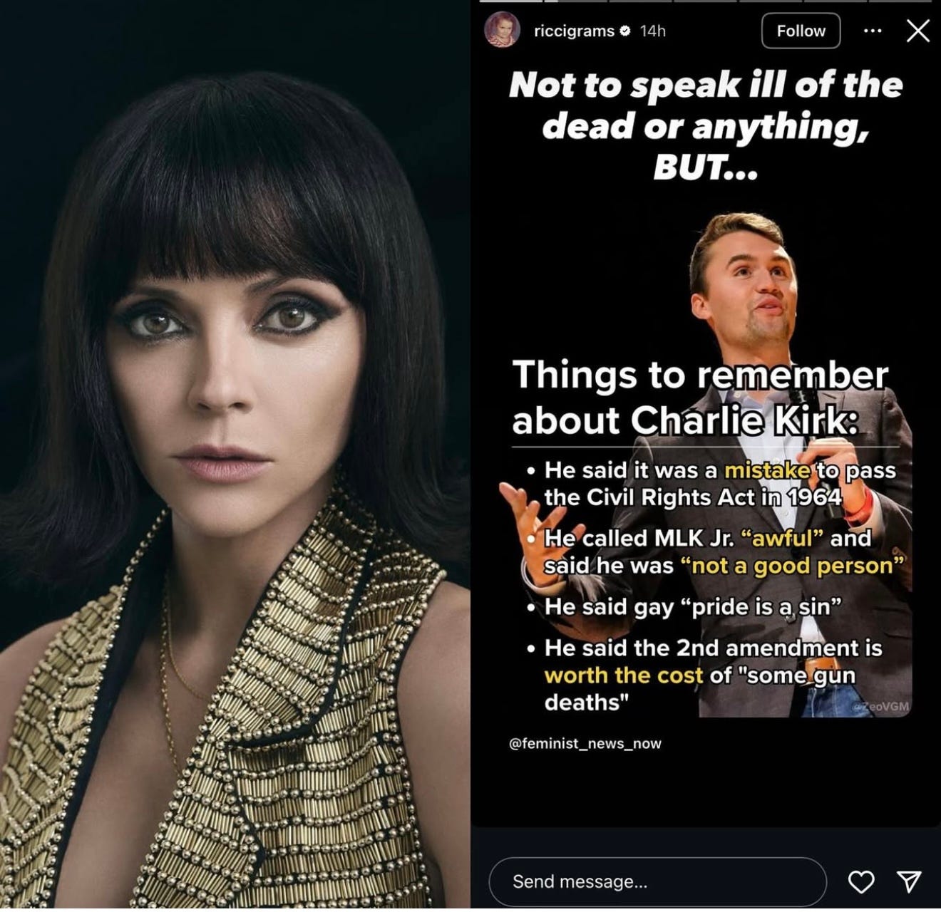 Christina Ricci posted on Instagram to remind everyone that she is a fascist. Her post, “Not to speak ill of the dead,” lists Charlie Kirk’s supposed thought crimes. What she seems to be saying is that it’s okay, he’s dead, and this is what he thinks.