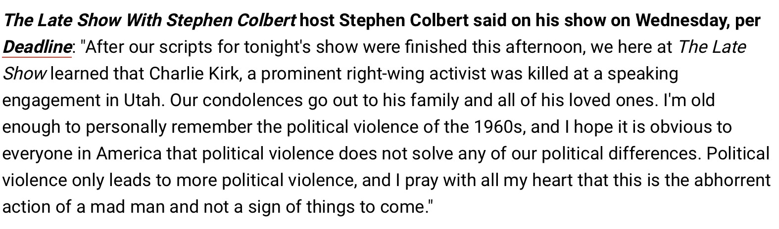 Shockingly, Stephen Colbert also held his tongue and forced out some kind of message that wasn’t fascist: